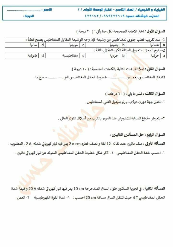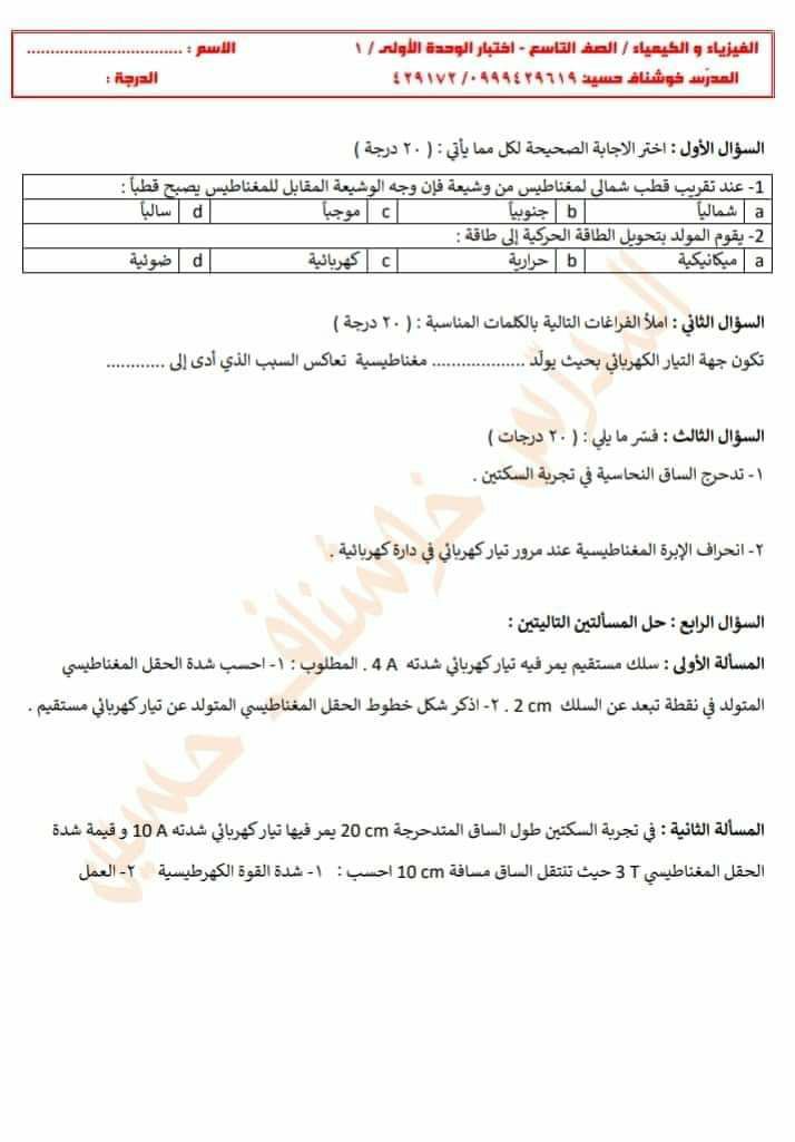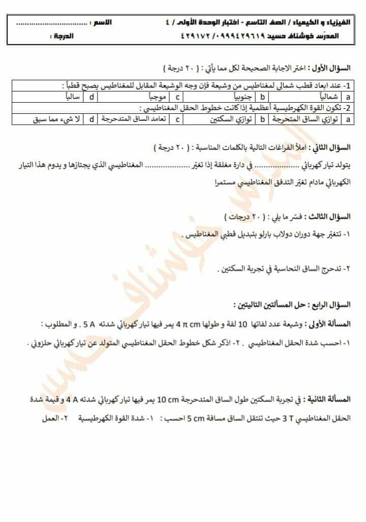 أربع نماذج اختبارات للوحدة الأولى فيزياء وكيمياء للتاسع المنهاج السوري