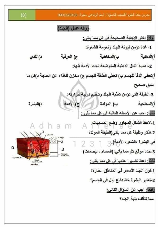 أوراق عمل في مادة العلوم +الرسومات دقة عالية للصف التاسع المنهاج السوري
