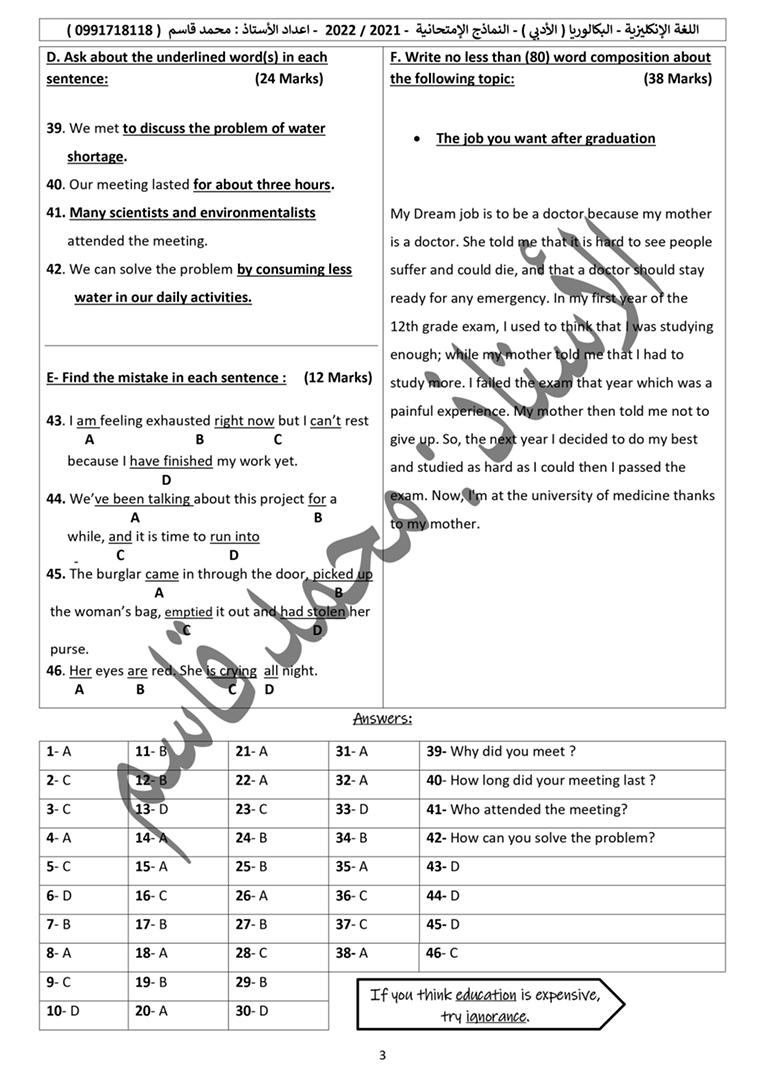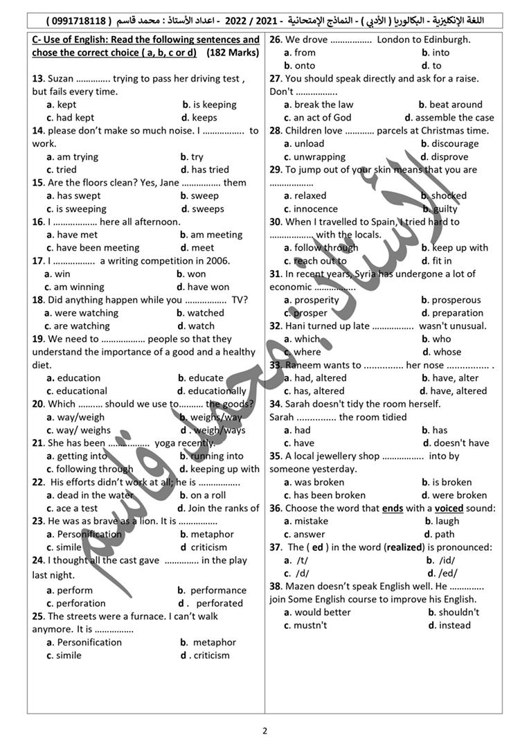 بنك النماذج الامتحانية اللغة الانكليزية بكالوريا أدبي المنهاج السوري