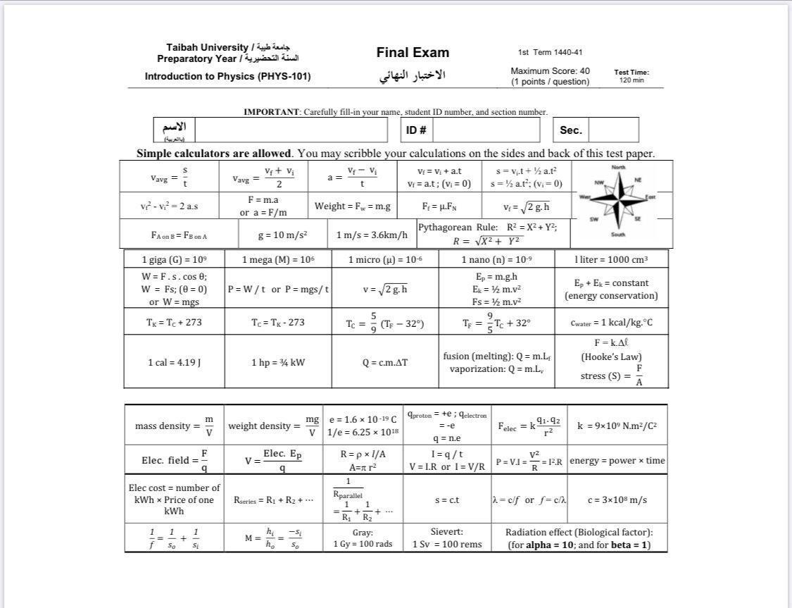 تجميعات الفاينل فيزياء السنة التحضيرية جامعة طيبة