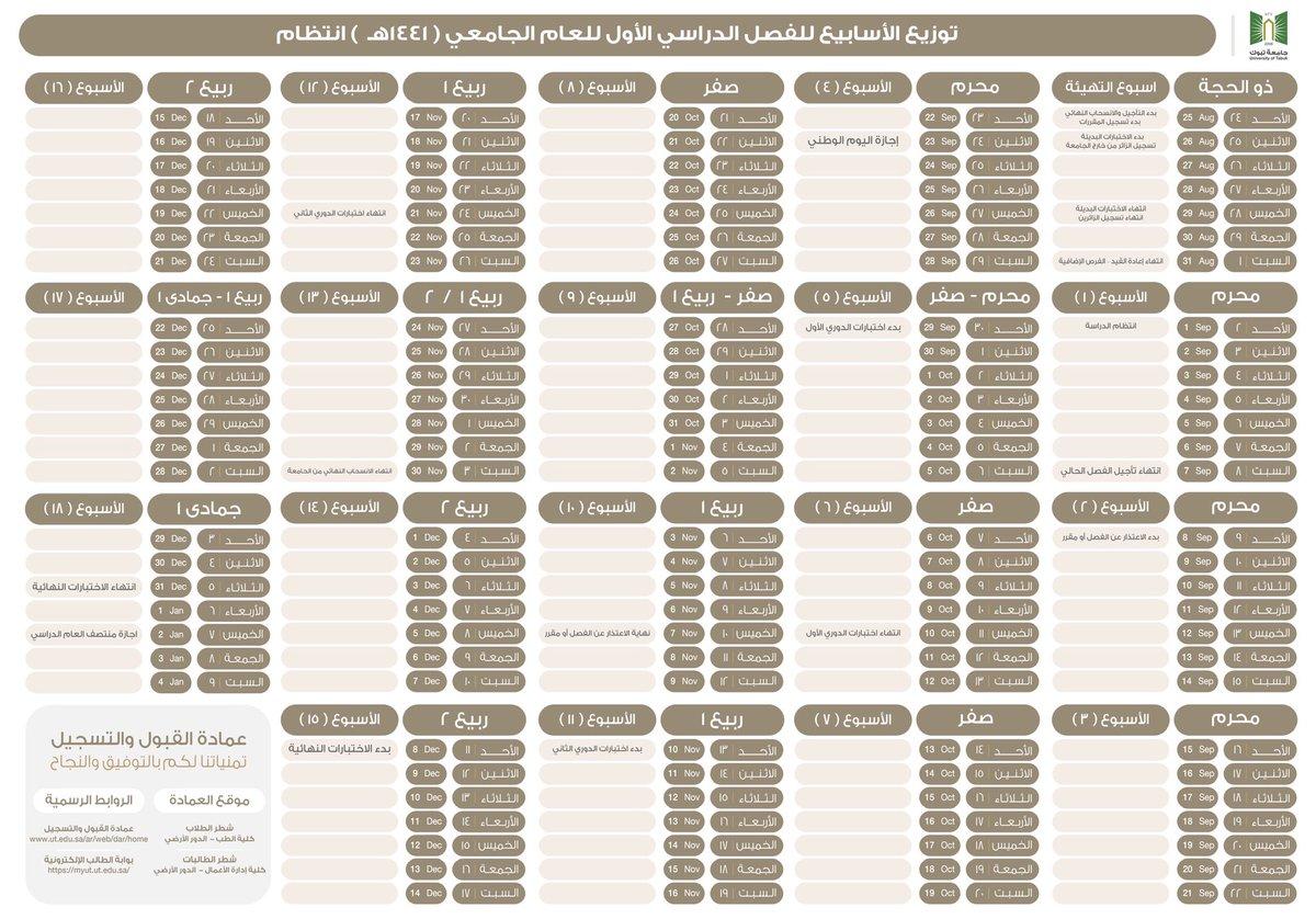 توزيع الاسابيع الفصل الاول للعام الجامعي 1441 انتظام جامعة تبوك
