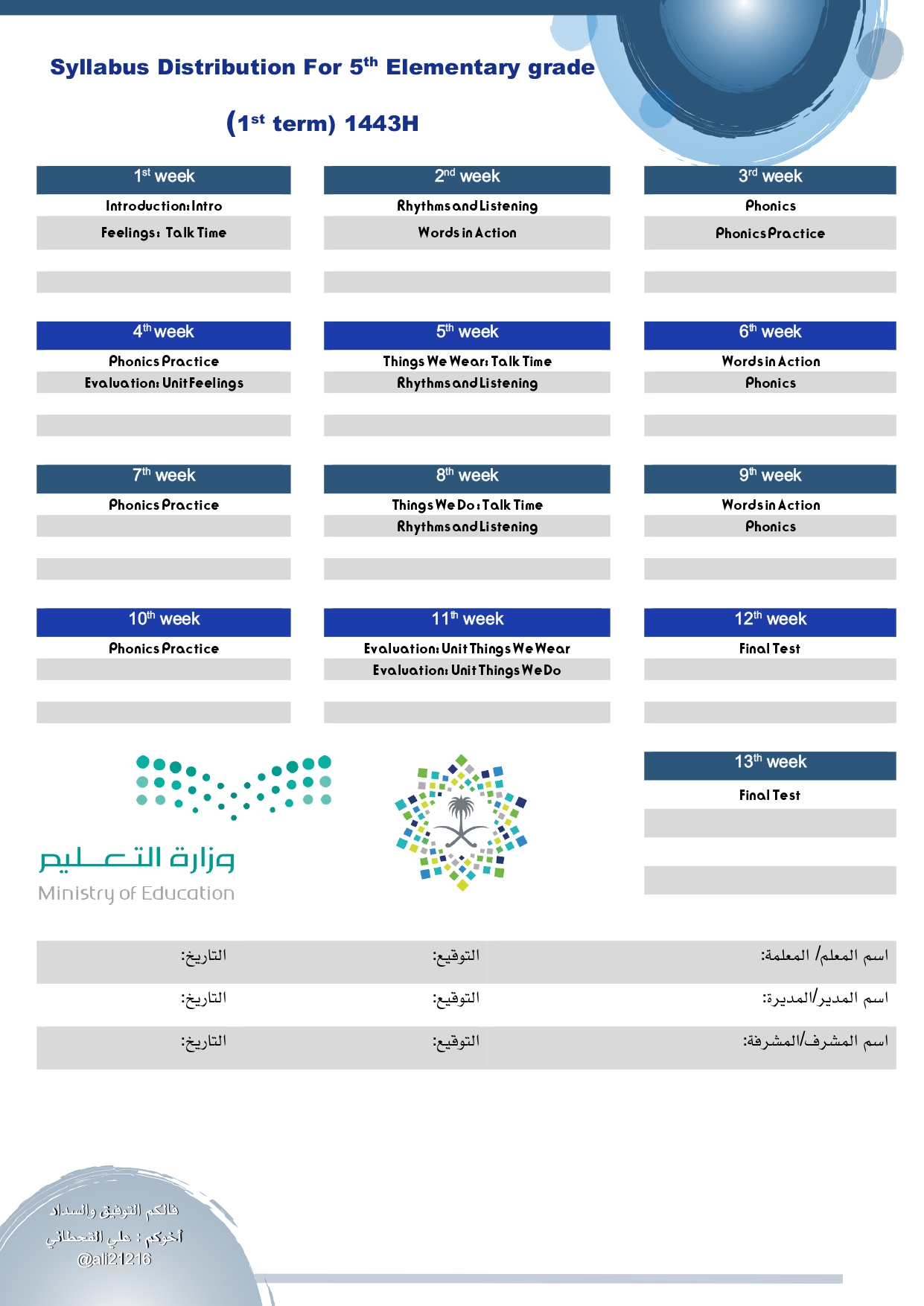 توزيع منهاج الإنجليزي للصف الخامس الابتدائي الفصل الأول 1443 هـ