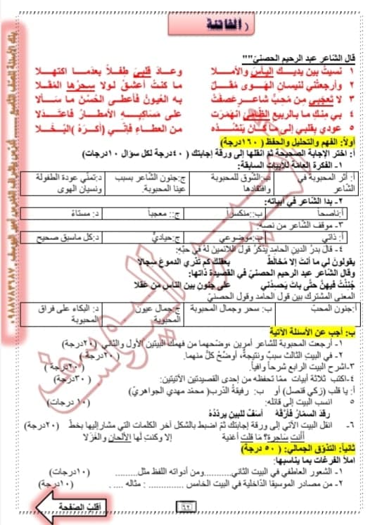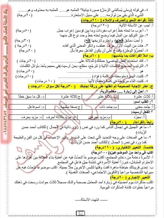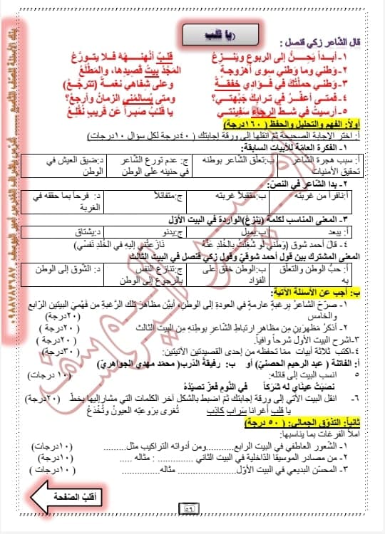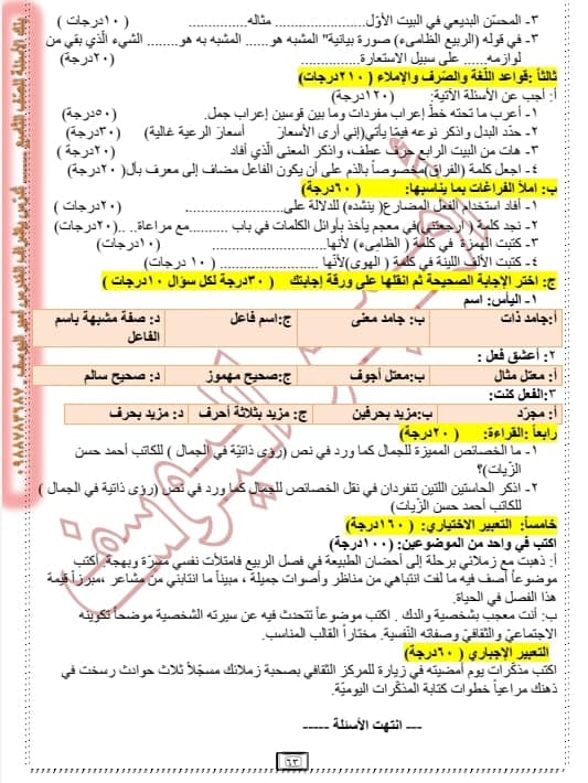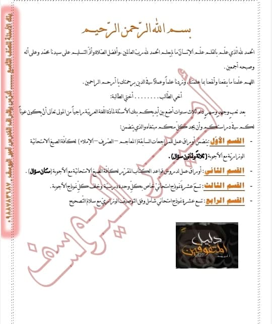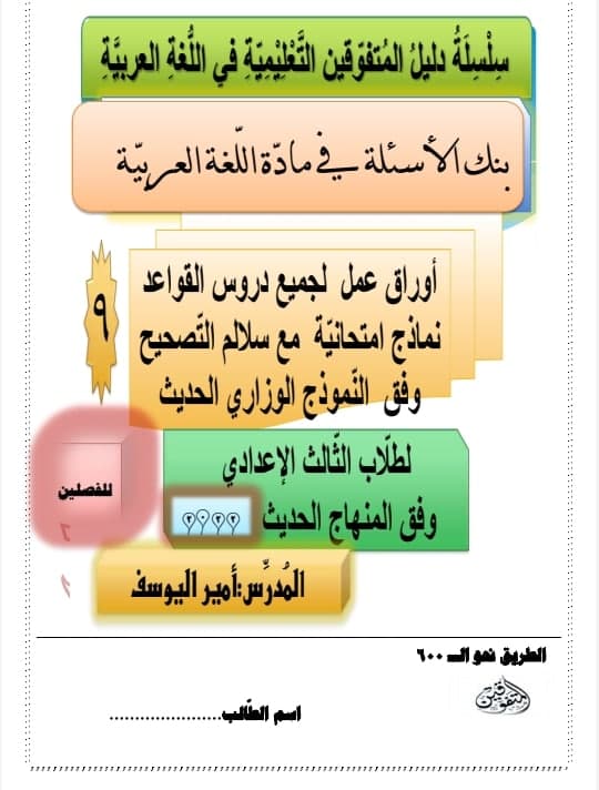 ثلاثة نماذج امتحانية للوحدة الخامسة من بنك الأسئلة لمادّة اللغة العربية تاسع المنهاج السوري