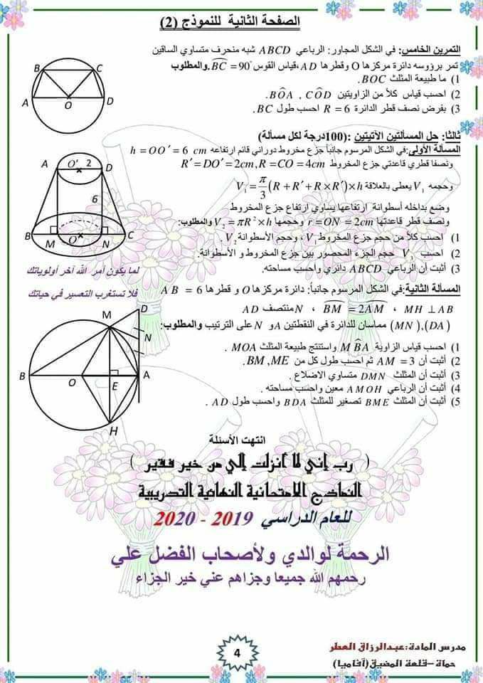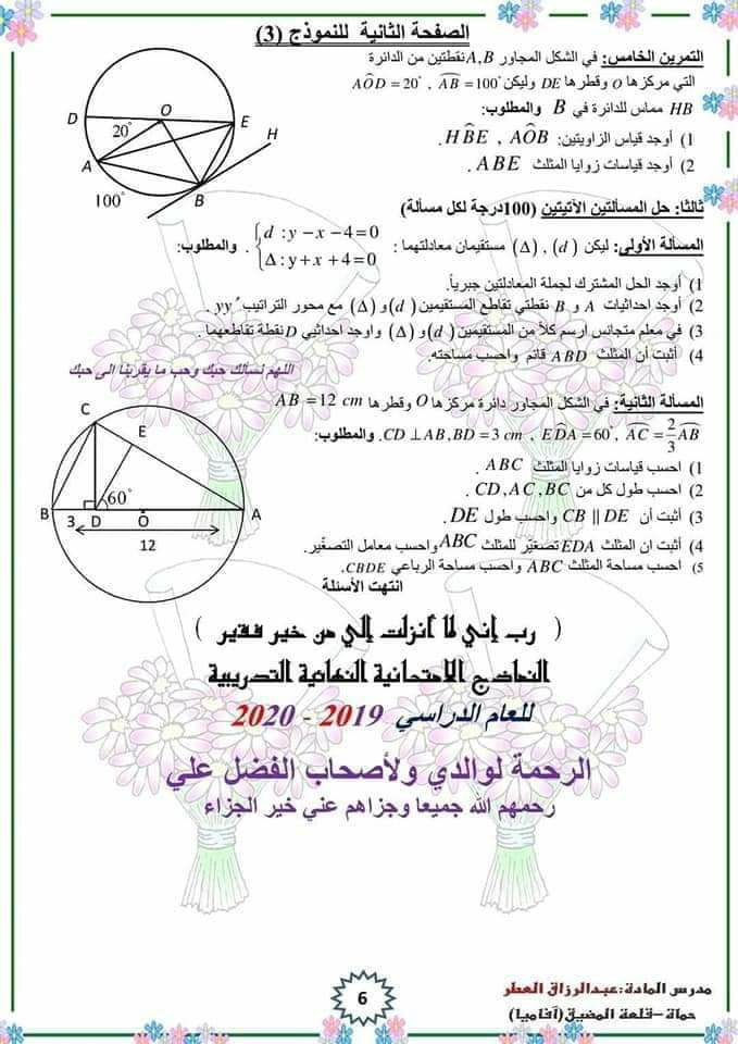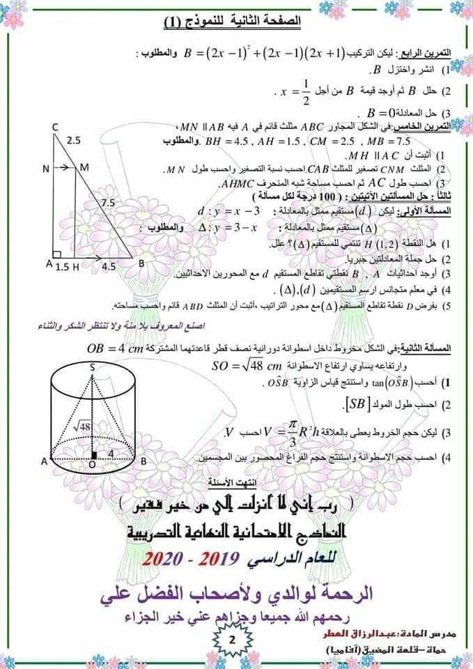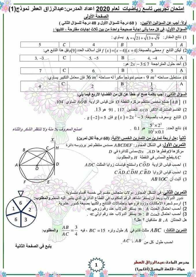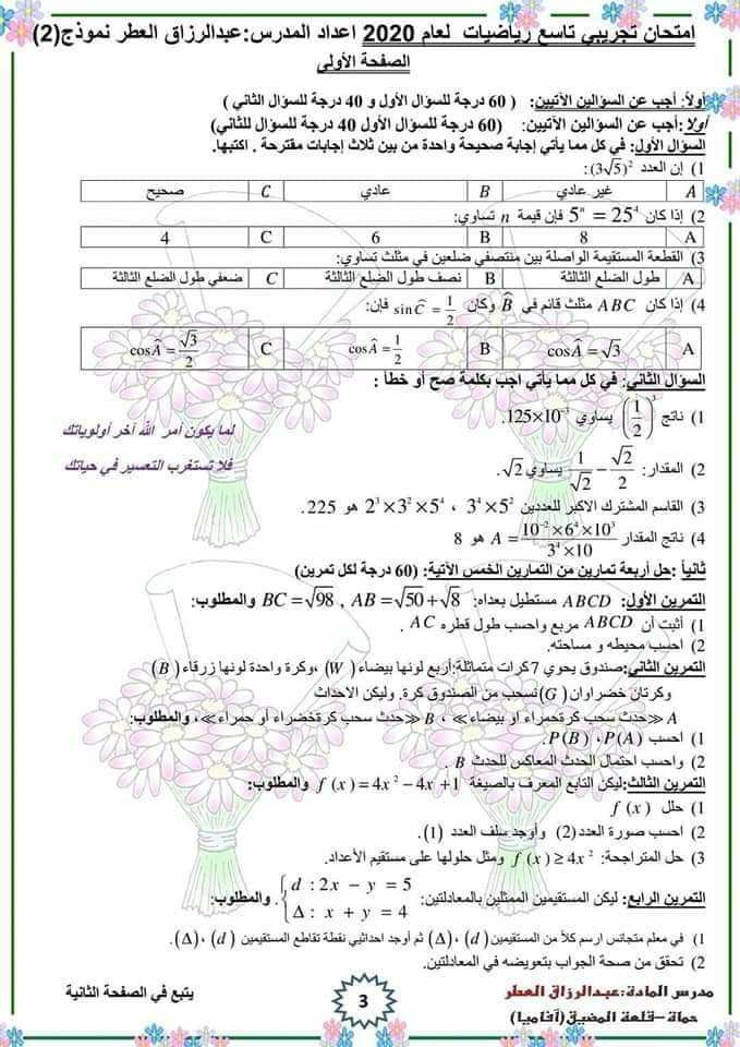 ثلاث نماذج امتحانية رياضبات الصف التاسع المنهاج السوري