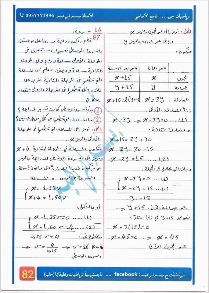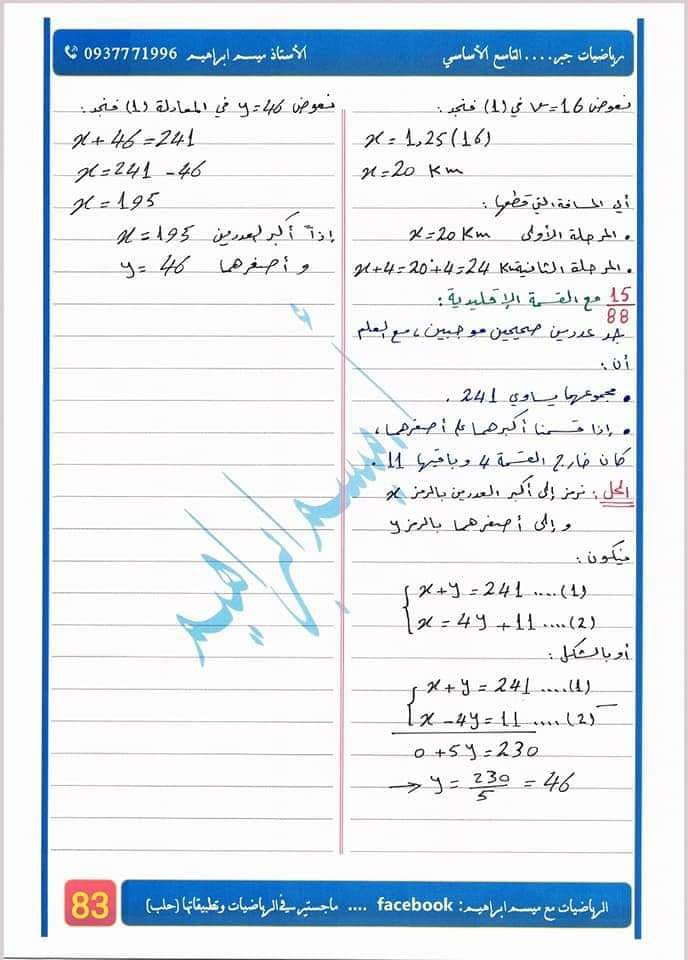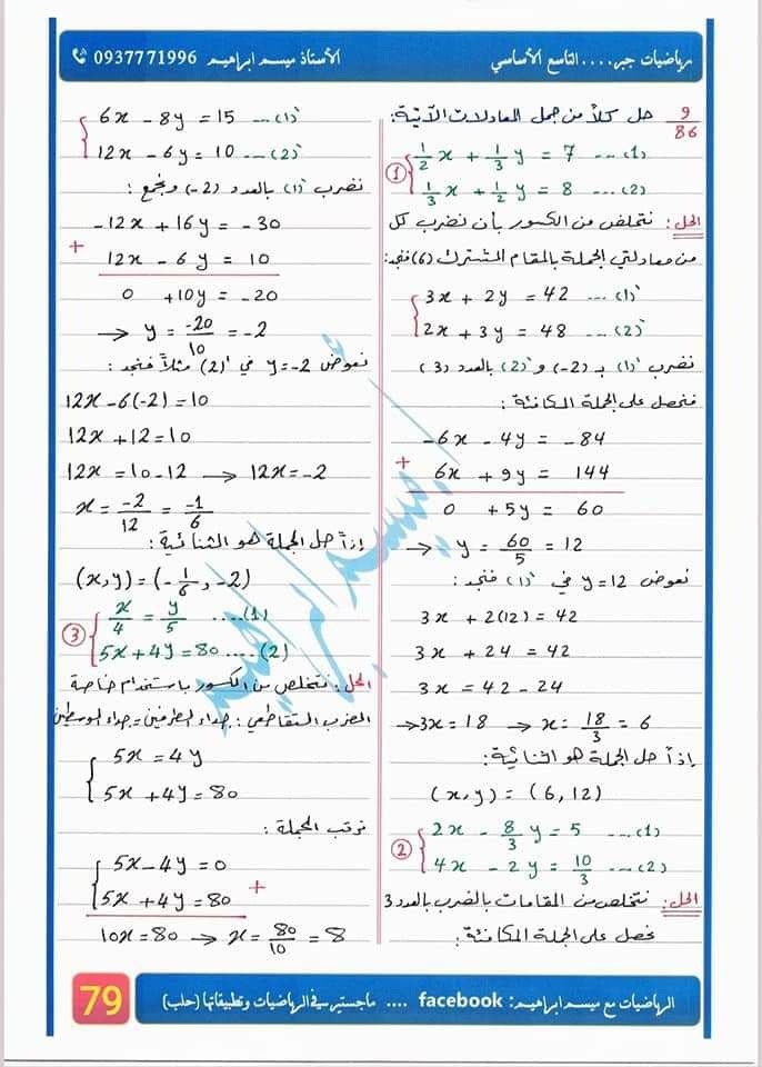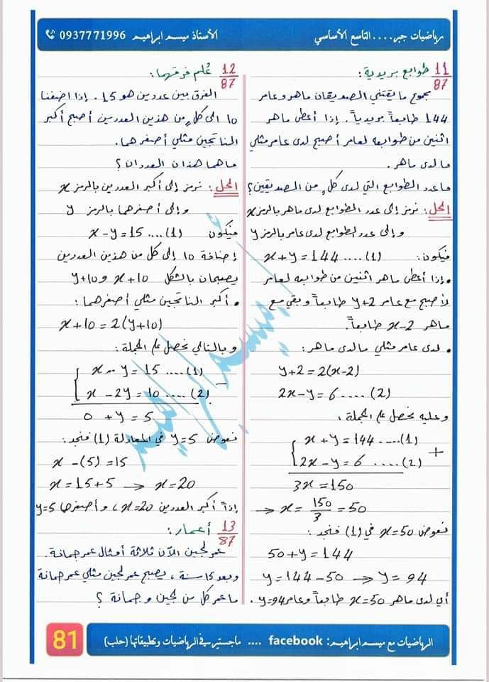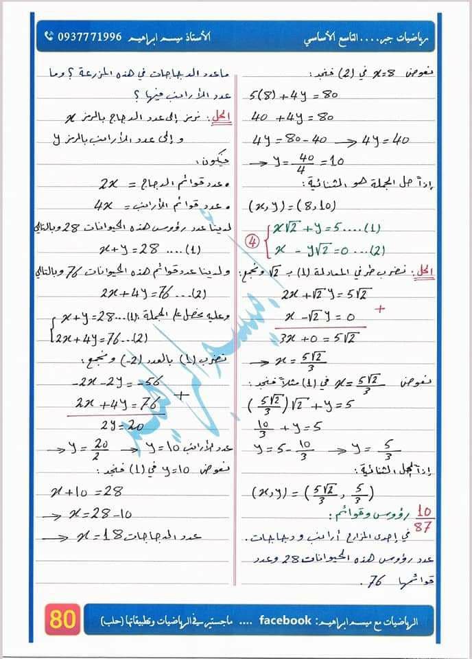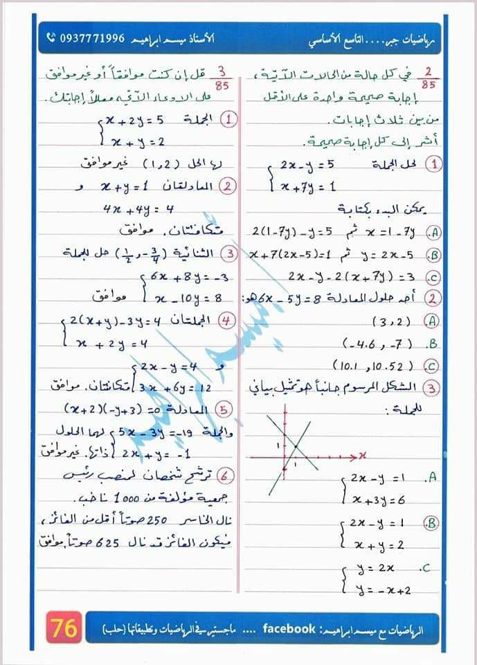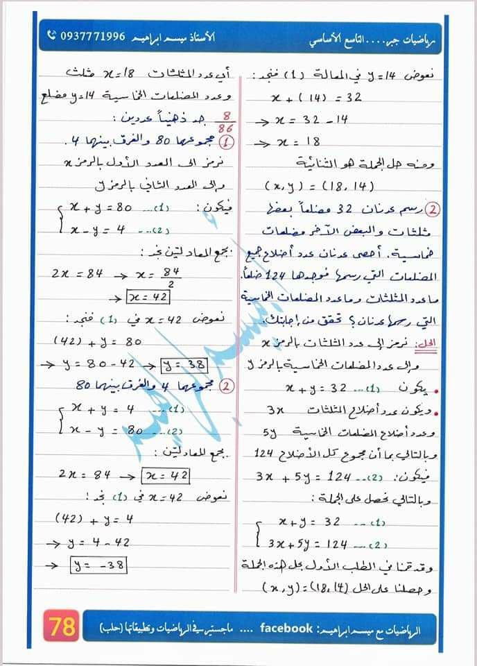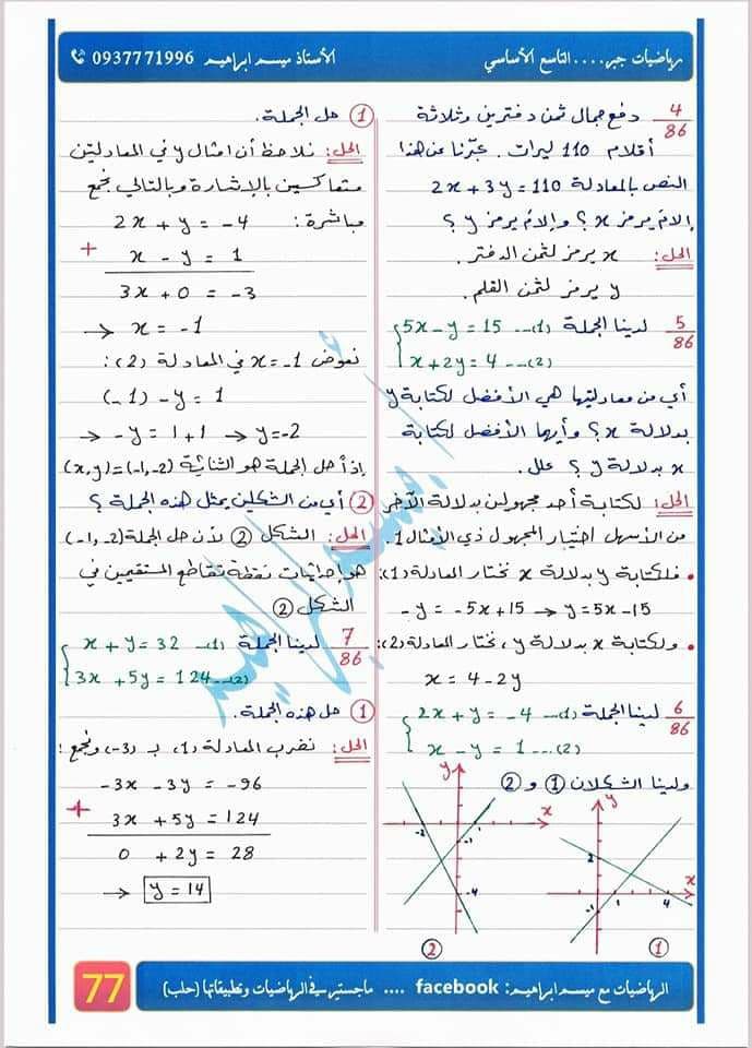 حل جميع تمرينات و مسائل الوحدة الرابعة جمل المعادلات جبر الصف التاسع المنهاج السوري