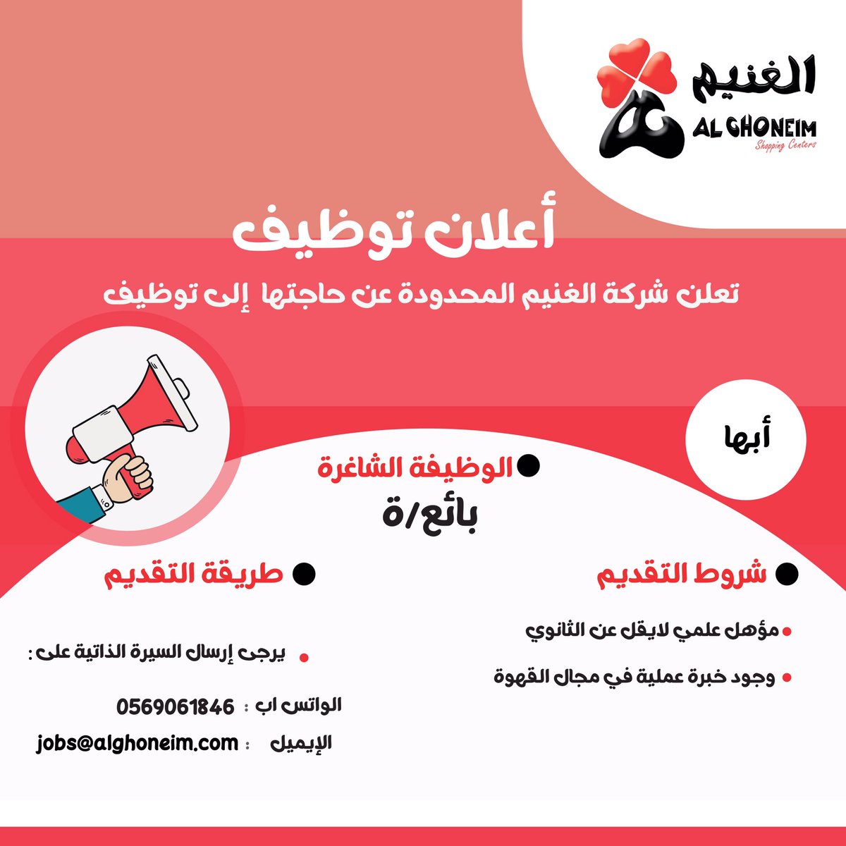 شركة أسواق الغنيم توفر وظائف شاغرة لحملة الثانوية فأعلى في (أبها) و (خميس مشيط)..أعلنت شركة أسواق الغنيم توفر وظائف شاغرة لحملة الثانوية فأعلى في (أبها) و (خميس مشيط)، واشترطت الشركة أن يكون المتقدم أو المتقدمة سعودي الجنسية، وذلك وفقاً للتفاصيل وطريقة التقديم الموضحة أدناه.