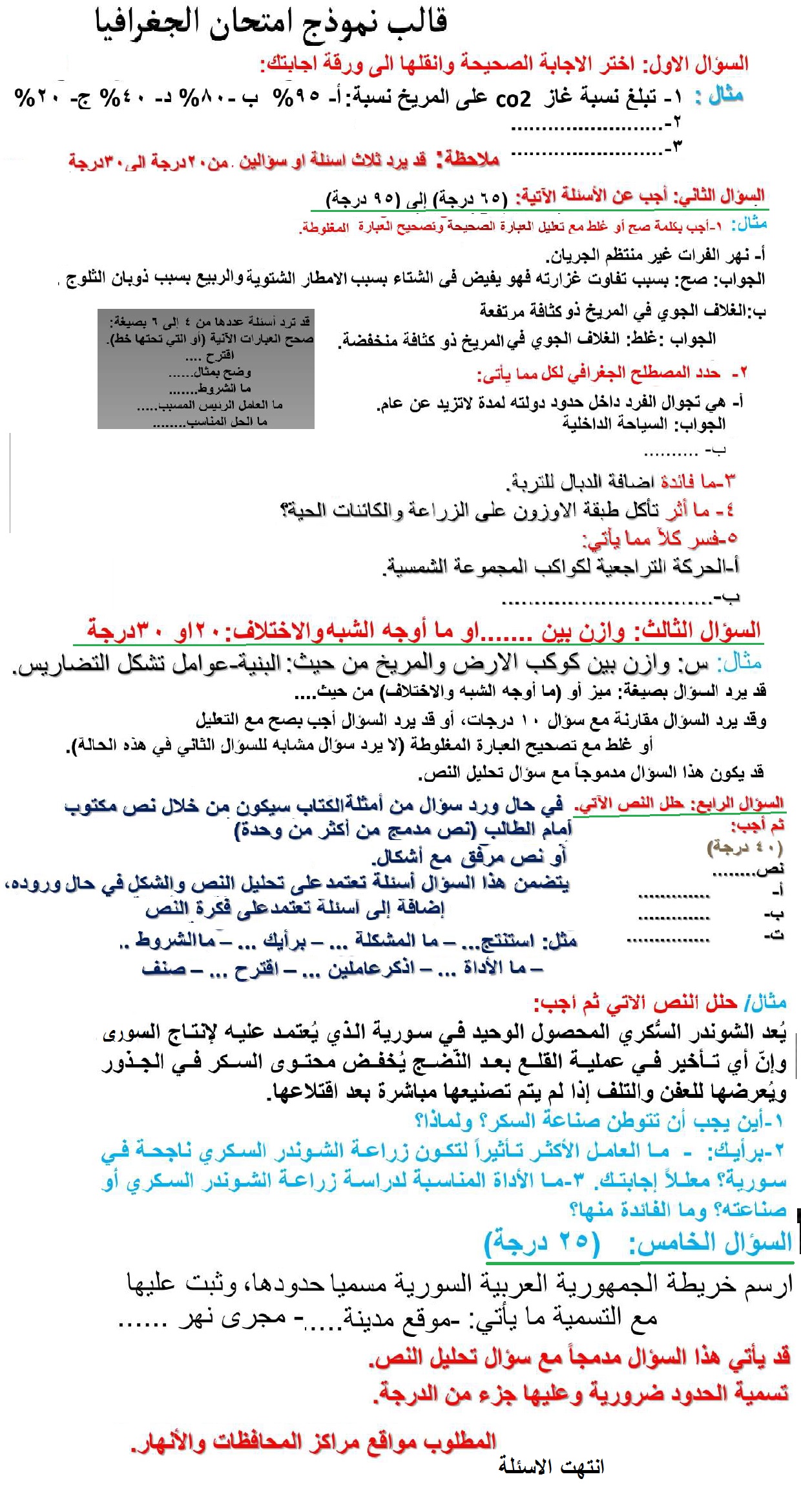 قالب إمتحان جغرافيا مع مثال للتاسع المنهاج السوري