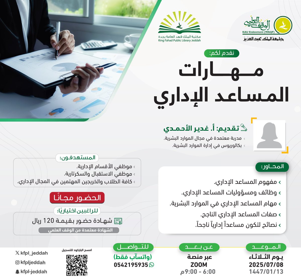 مكتبة الملك فهد العامة تعلن 9 دورات تدريبية مجانية (عن بُعد) في يوليو 2025 …أعلنت مكتبة الملك فهد العامة بجدة بالتعاون مع الوقف العلمي بجامعة الملك عبدالعزيز عن إقامة 9 دورات تدريبية مجانية (عن بُعد) خلال شهر يوليو 2025م، وذلك في مجالات إدارية وتقنية وتطوير ذاتي متنوعة، وستكون شهادات الحضور اختيارية برسوم، وذلك وفقاً للتفاصيل الموضحة أدناه.