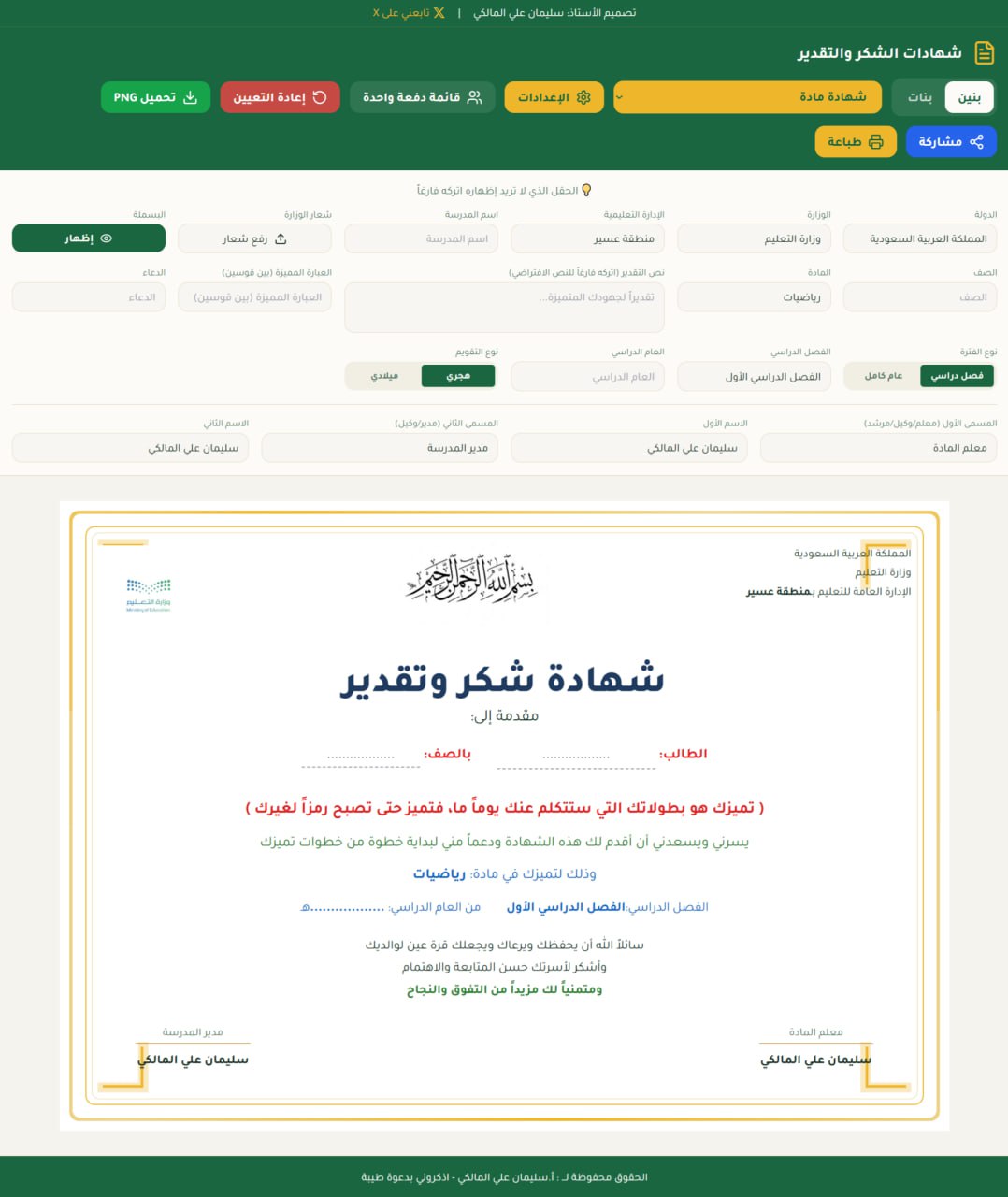 موقع لشهادات الشكر يختصر الكثير من الإعداد لها للمعلم _ للوكيل_ للمرشد