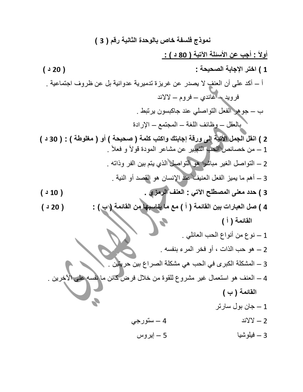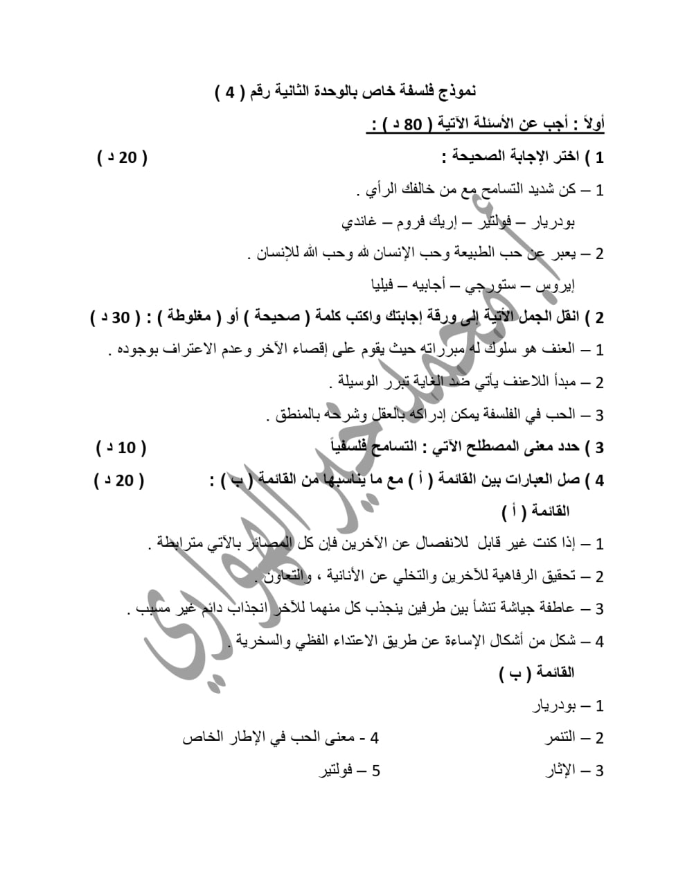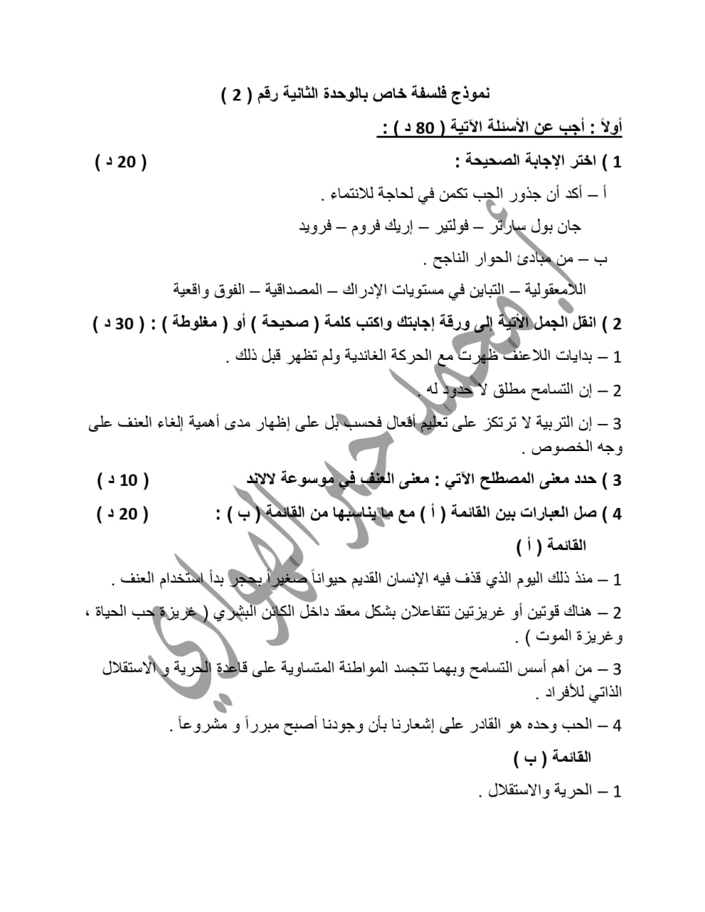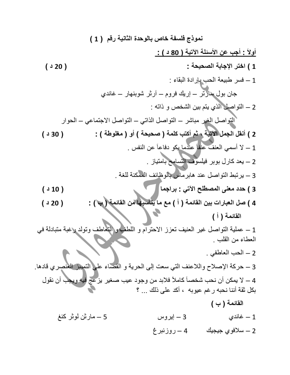 نماذج امتحانية مادة الفلسفة الوحدة الثانية بكالوريا ادبي المنهاج السوري