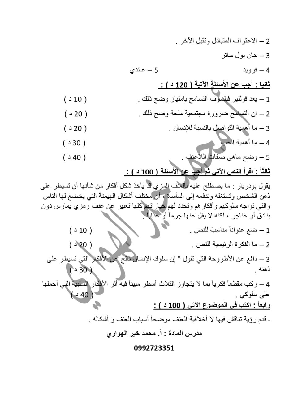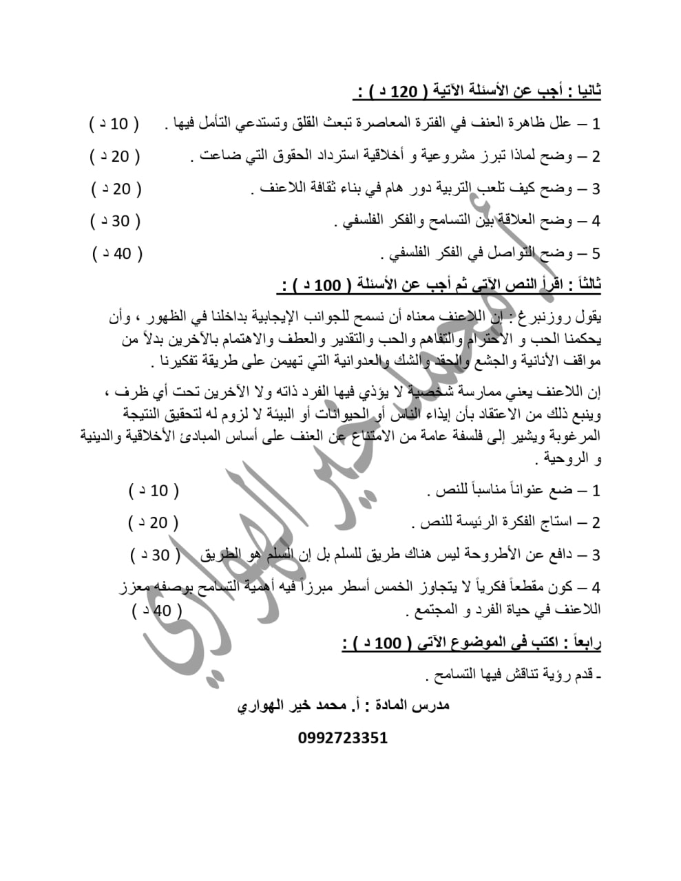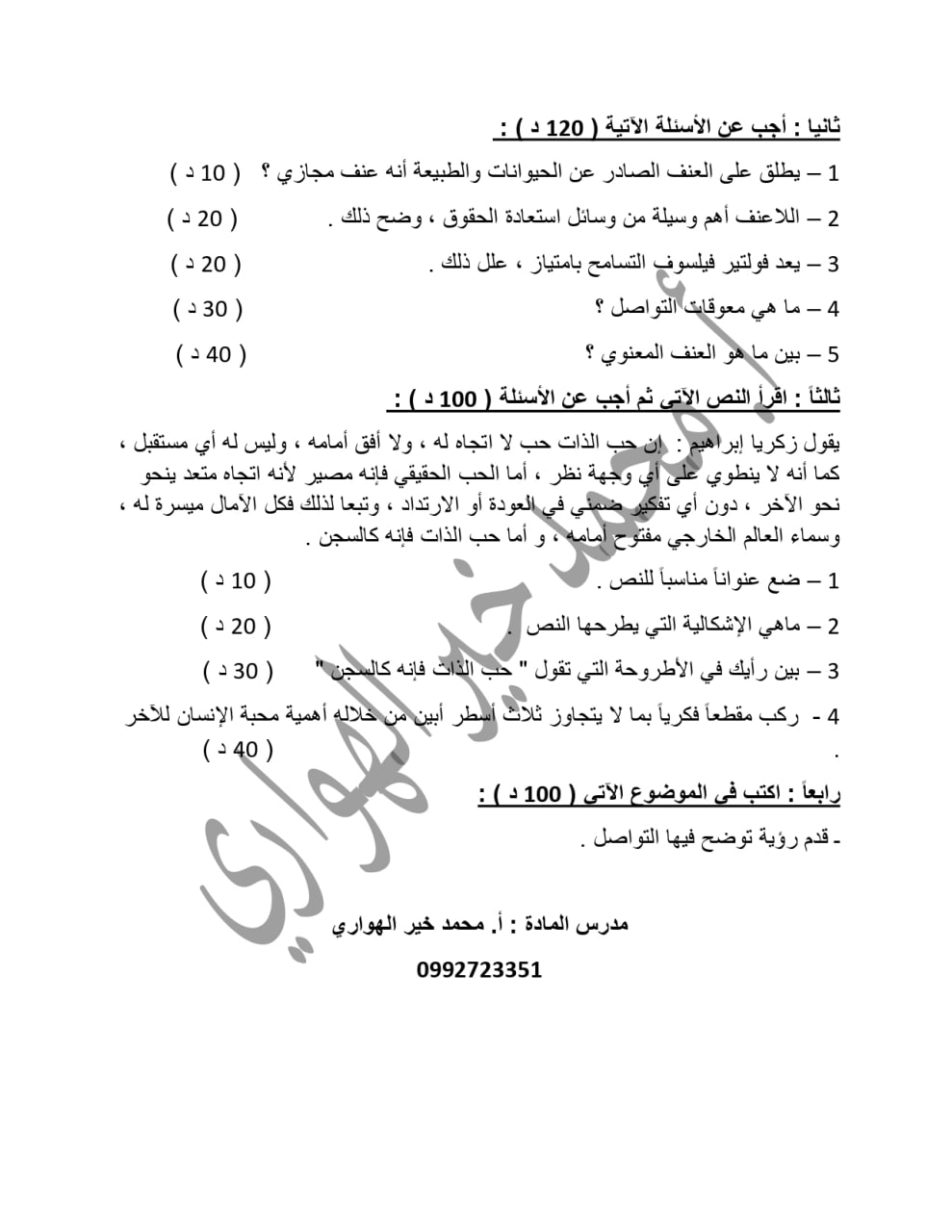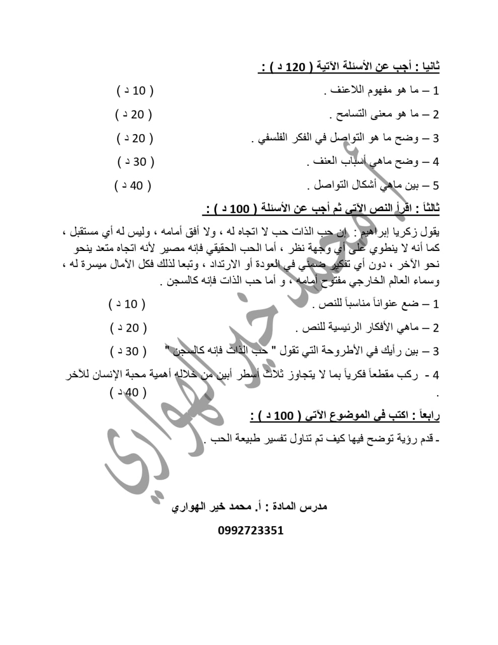 نماذج امتحانية مادة الفلسفة الوحدة الثانية بكالوريا ادبي المنهاج السوري