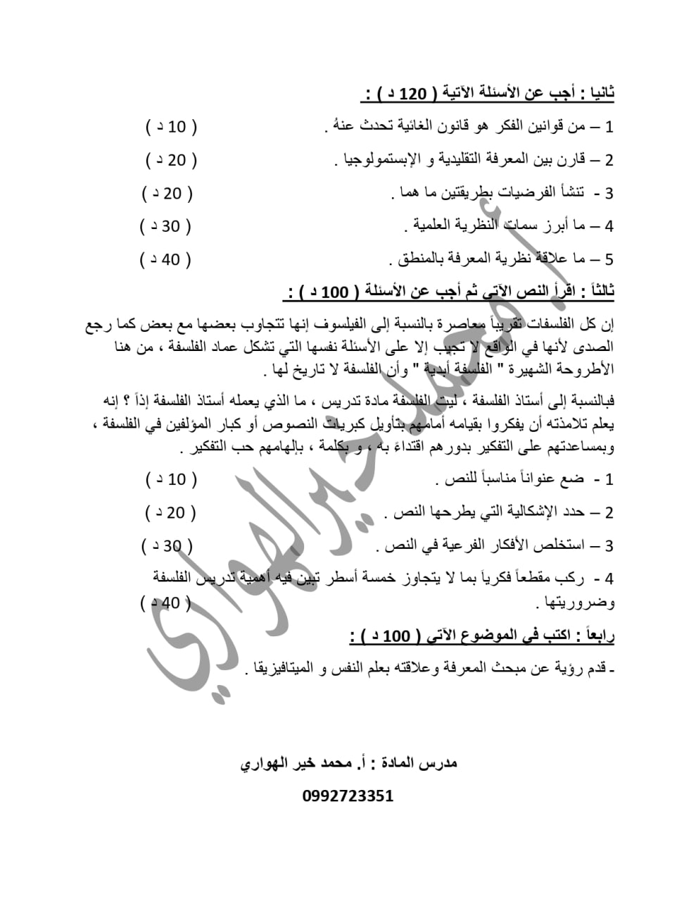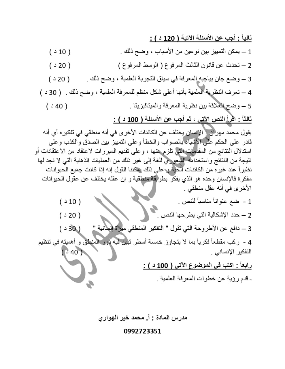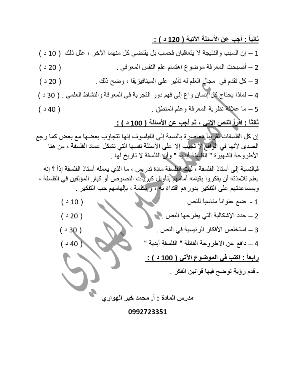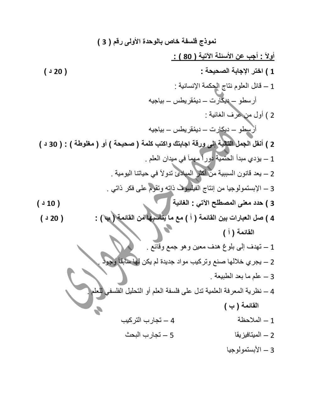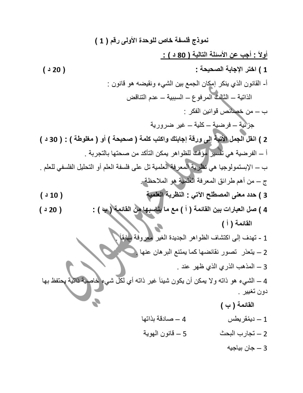 نماذج امتحانية مادة الفلسفة الوحدة الاولى بكالوريا ادبي المنهاج السوري
