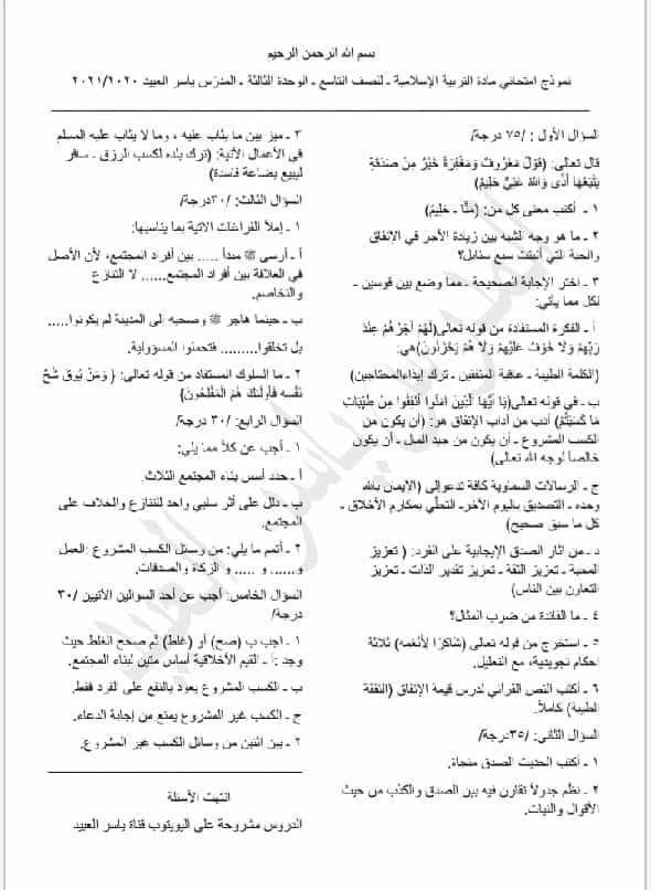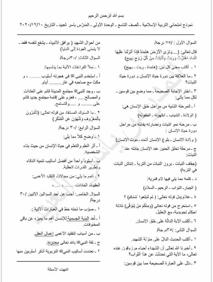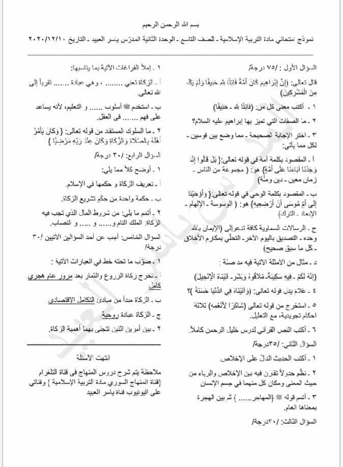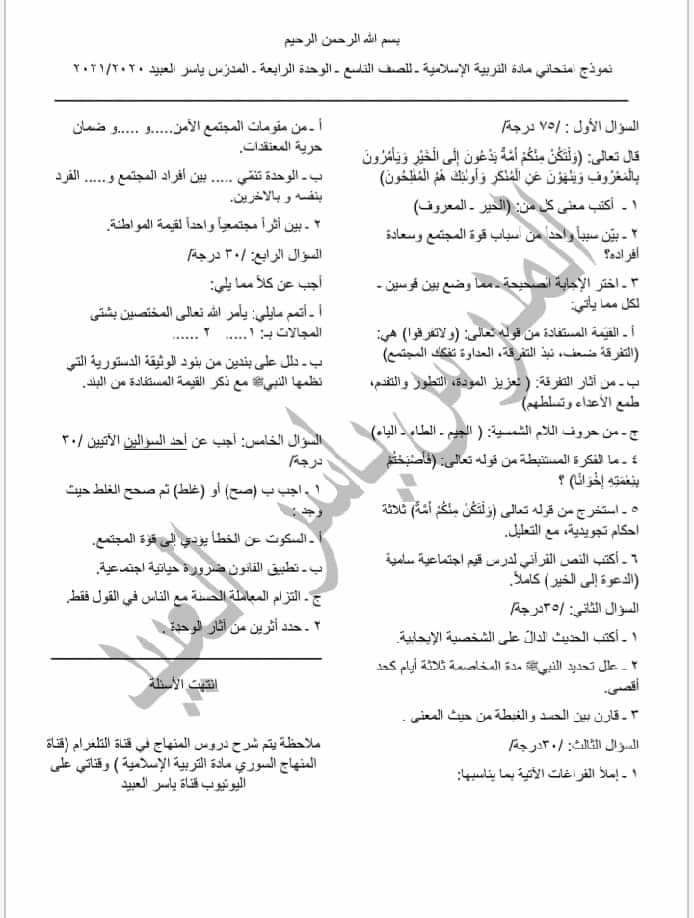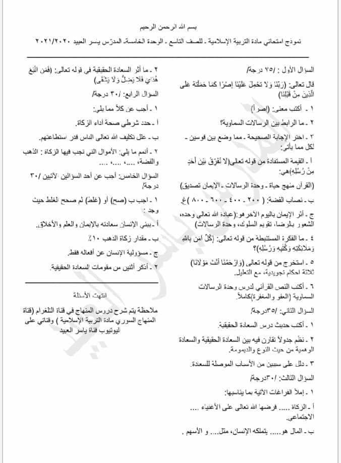نماذج امتحان عن الوحدات الأربعة ديانة الصف التاسع المنهاج السوري