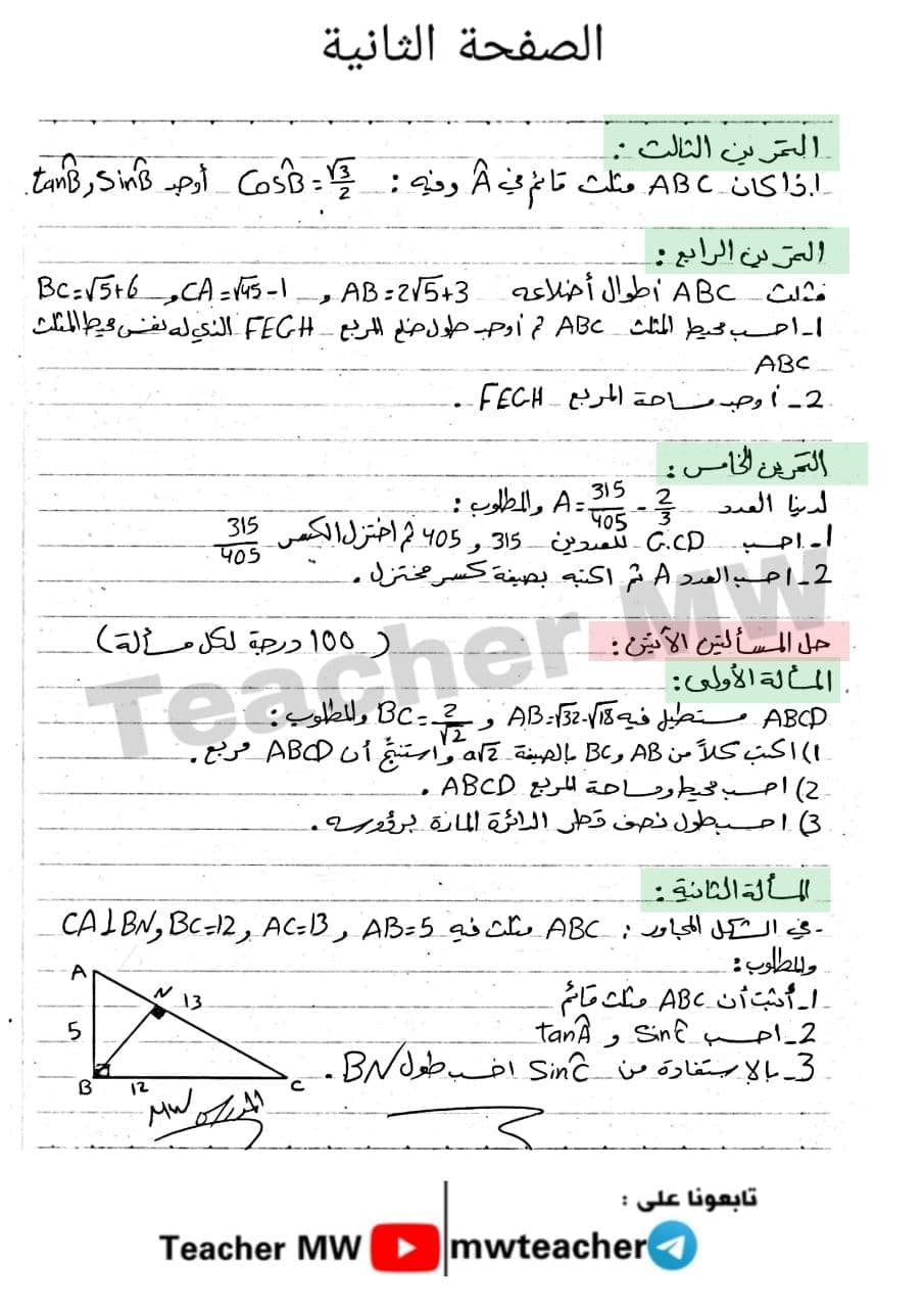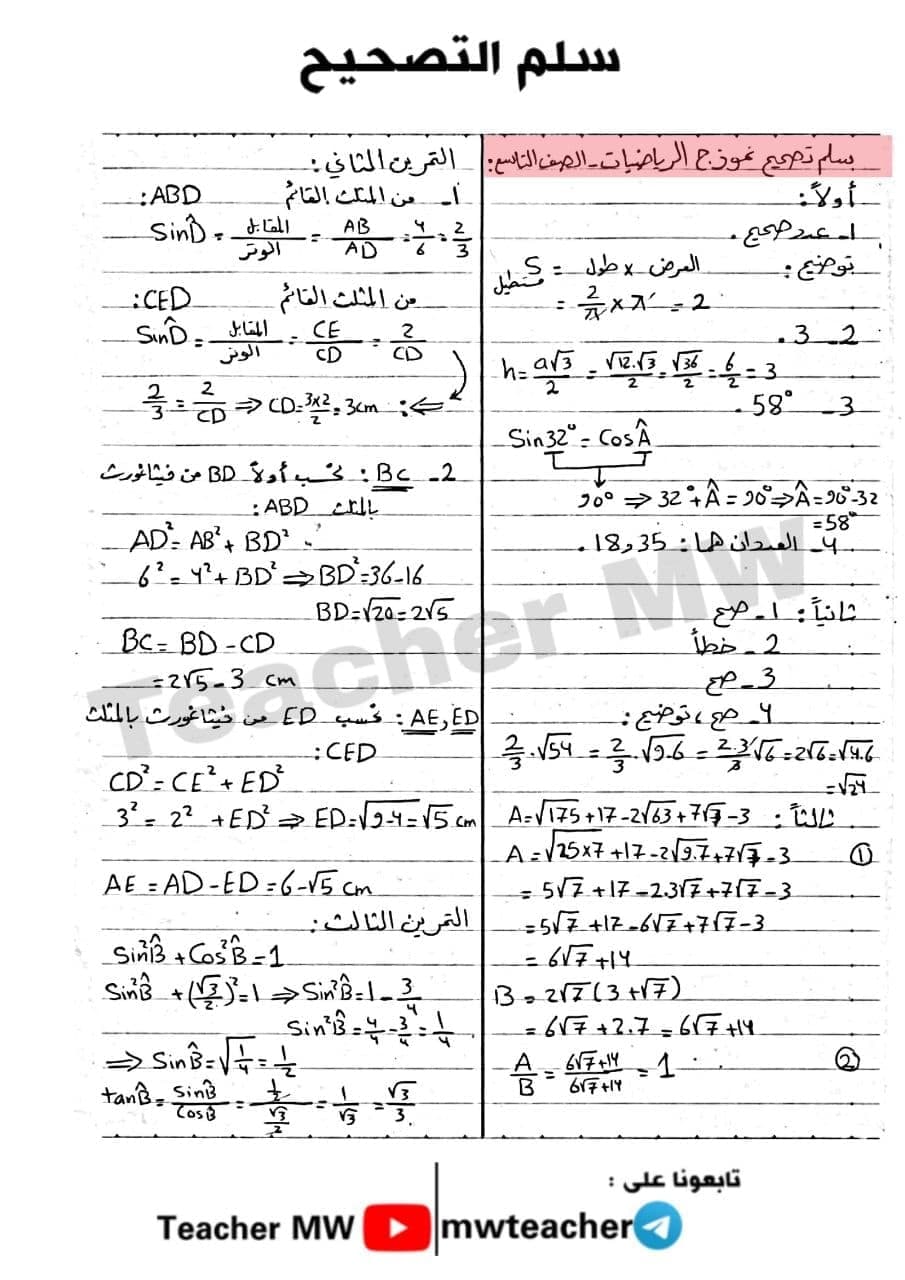 نمودج امتحان رياضيات مع سلم التصحيح الصف التاسع المنهاج السوري