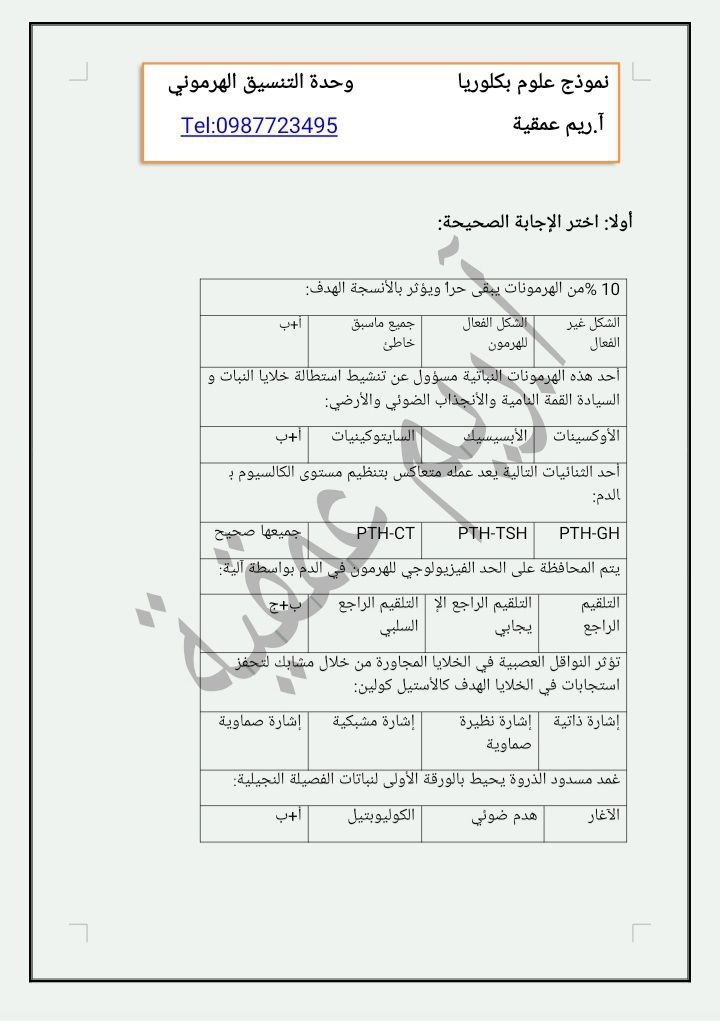 نموذج امتحاني علوم وحدة التنسيق الهرموني بكالوريا المنهاج السوري