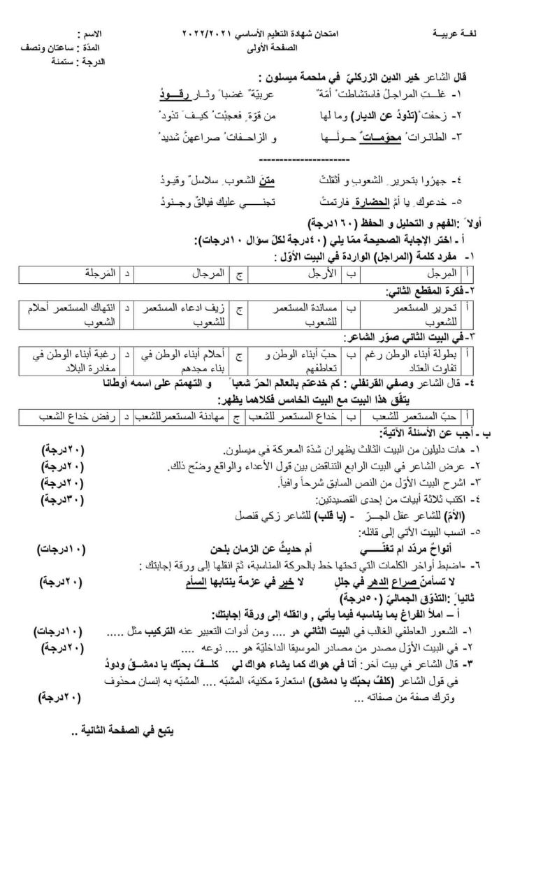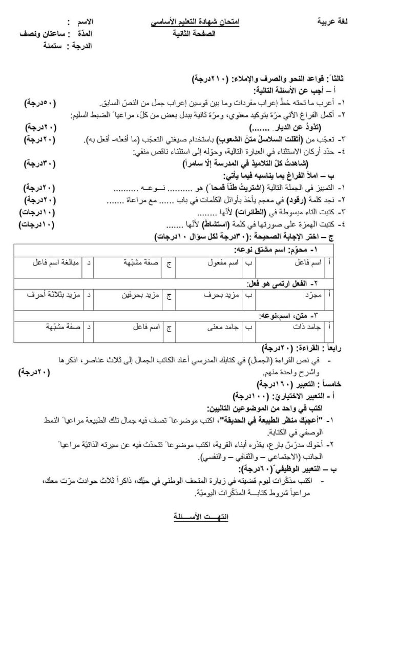 نموذج امتحاني لغة عربية للصف التاسع المنهاج السوري