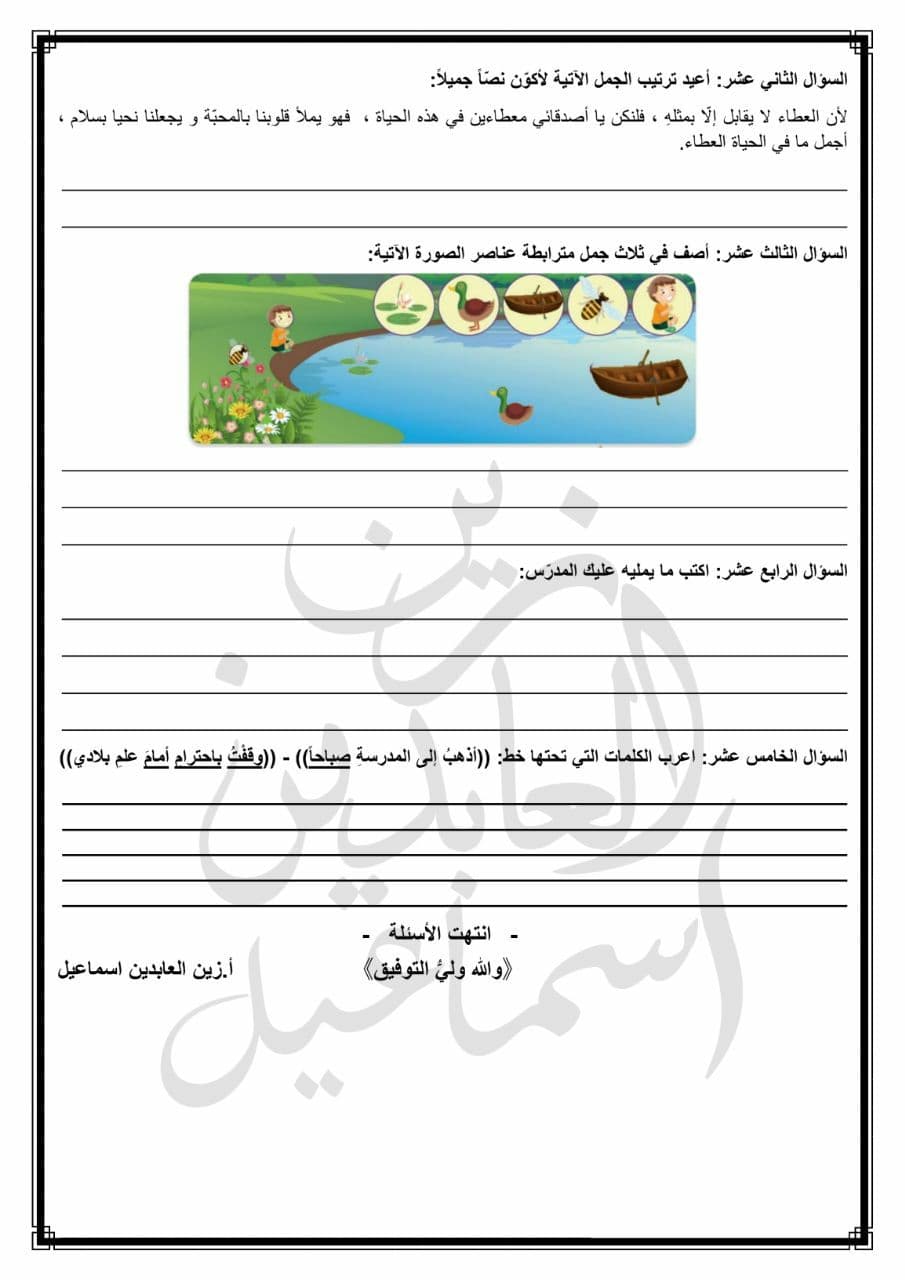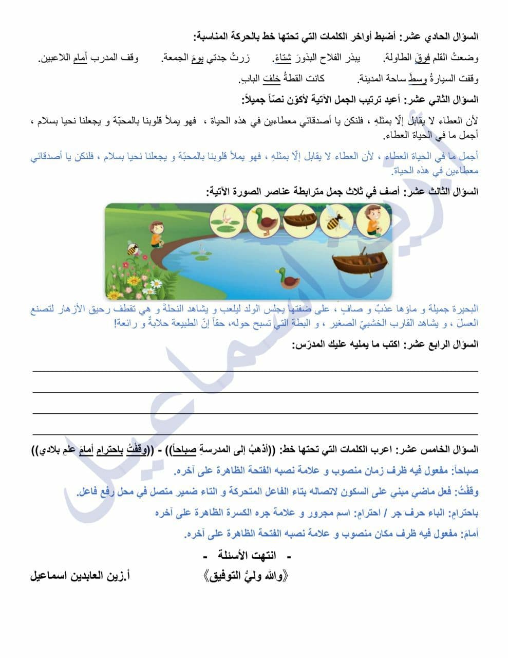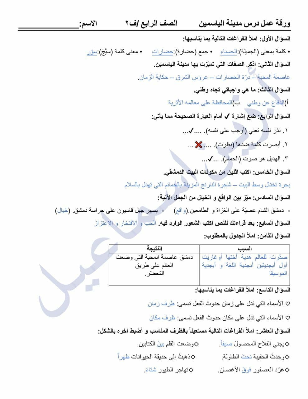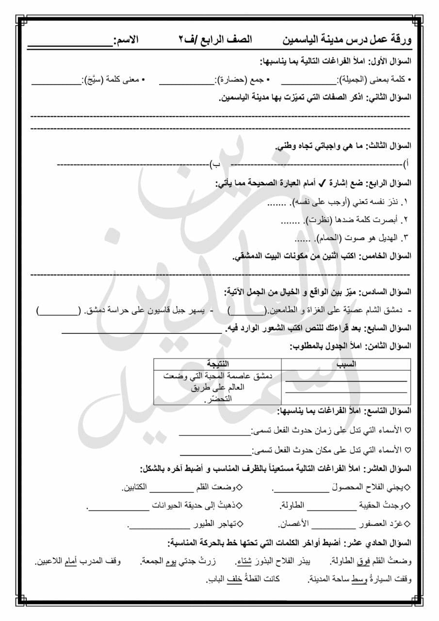 ورقة عمل مع الحل درس مدينة الياسمين الصف الرابع المنهاج السوري